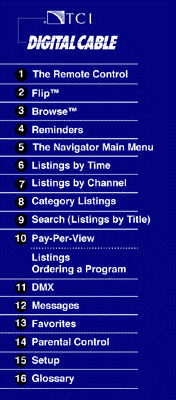 With Prevue Interactive, you get more than just program information. Using the universal remote control, you can lock out channels using Parental Control, order Pay-Per-View programs, and scan through your favorite channels. Take a few minutes to study this guide to learn about convenient features such as Flip, Browse and the navigator main menu, all of which will help you get the most out of TCI Digital Cable.