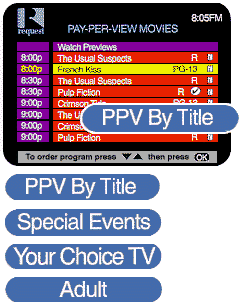 With Pay-Per-View listings you can see program offerings by time, by program title, by adult