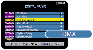- You can also access the DMX listings by pressing the MUSIC button on your remote control.